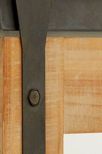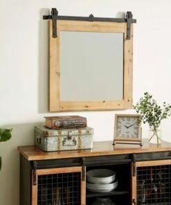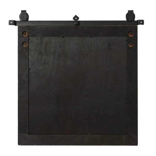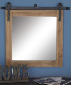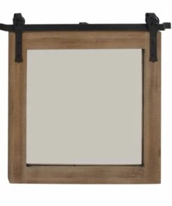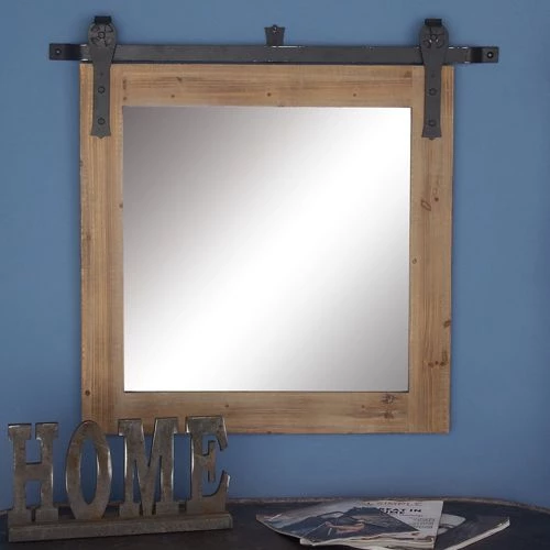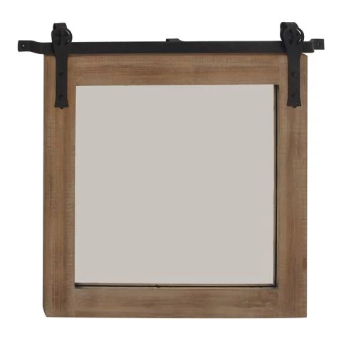 - This hanging wall mirror is made from a metal bracket, wood frame, and glass center