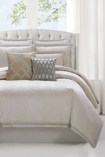 A luxury jacquard weave with delicate hues of ivory and champagne, creating an inviting top of bed. The overscale medallion pattern possesses a sophistication in the subtle colors and dominated the face of the bed. The face fabric is a 100% polyester fine jacquard woven material. The closer you get to the fabric the more detail you can see and the subtle patterns emerges in the fabric.Known as America’s premier luxury brand in home, for over 30 years Charisma is synonymous with understated elegance, softness and feminine details. All Charisma products have quality workmanship balancing clean lines with smart details using only the finest materials. Timeless design, attention to detail and luxury of comfort Charisma is the art of living well, beautifully and is luxuriously made.