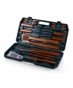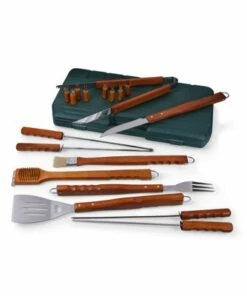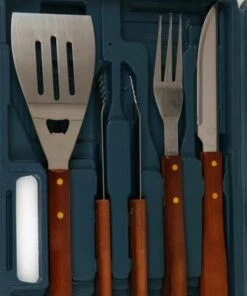 - All tools made of stainless steel with beautiful wood handles and loops at the ends so they can hang from your barbecue