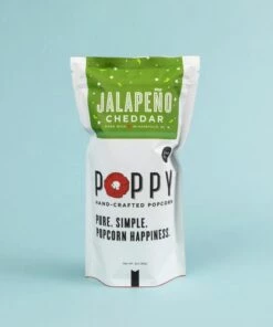 - Jalapeno Cheddar- Spicy, cheesy deliciousness! Cheddar popcorn dusted with jalapeno powder. This flavor has a real kick to it and pairs well with friends and drinks!