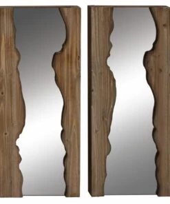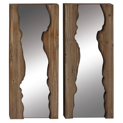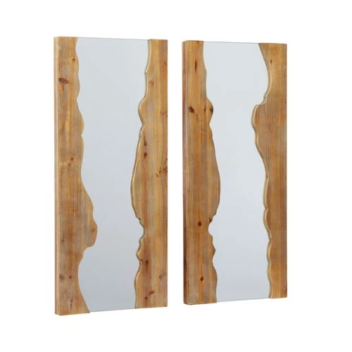 - Two naturally light and golden brown wood sections with natural grain and one-of-a-kind live edge silhouettes on either side of each of the long rectangular wall mirrors