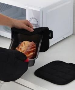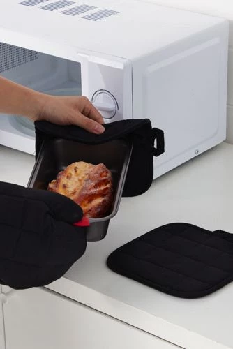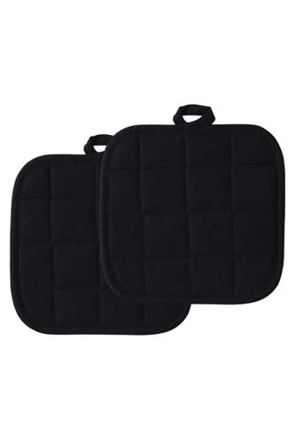 - Oven mitt and pot holders are made with 100% cotton exterior and filling. The quilted front and back keep filling securely in place