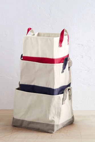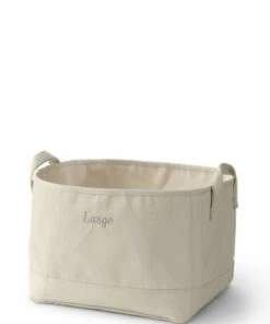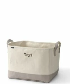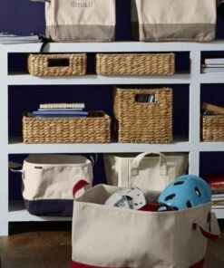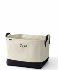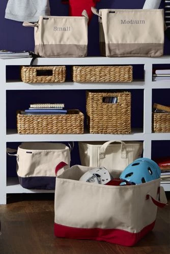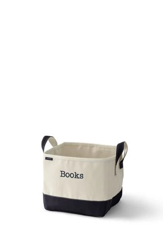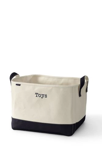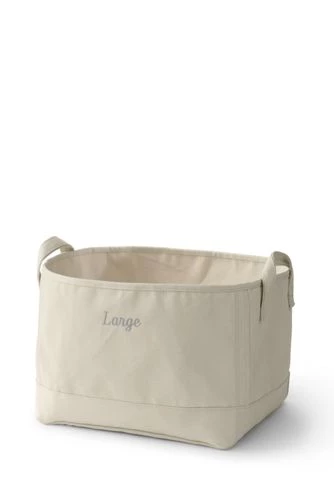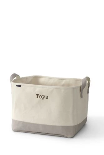 These attractive storage totes give your entryway or closet space a chic, clean look. They’re woven from smooth combed cotton into a rugged canvas. Wide, neatly-stitched felled seams resist fraying and provide a solid structure. And the bottom and handles are reinforced to be rip-resistant, ensuring the strength to support clothes, accessories and gear and making rearranging a snap. Add embroidery that reads “yoga,” “towels,” “his” or “hers” to make finding what you need even easier.Small: 12T”L X 9H”W X 10″H