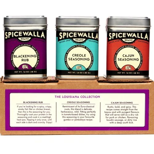 - The Louisiana Collection: Blackening Rub-1.6oz; Creole Seasoning- 1.2oz; Cajun Seasoning- 1.4oz