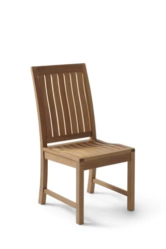 Take your seat at the table with this fantastic teak dining chair. Famous for its use on ship decks and in fine furniture, teak reflects our nautical roots and dedication to quality. We use only grade-A heartwood teak – strong, naturally oil-rich wood from a teak tree’s center that won’t warp or rot, whatever the weather. Over time, your teak will develop a beautiful silvery-gray patina with exposure to sun and moisture. If you’d prefer to preserve the original color, use a teak sealer.Like all our teak furniture, this armless dining chair is built with non-corrosive, rust-resistant hardware able to withstand foul weather any season of the year, like the teak itself. Shipped flat-packed with instructions for assembly.