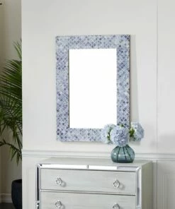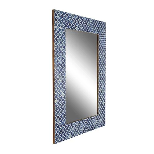 - This rectangle bone wall mirror carries a wooden frame accented with a mosaic of blue and white animal bone fragments