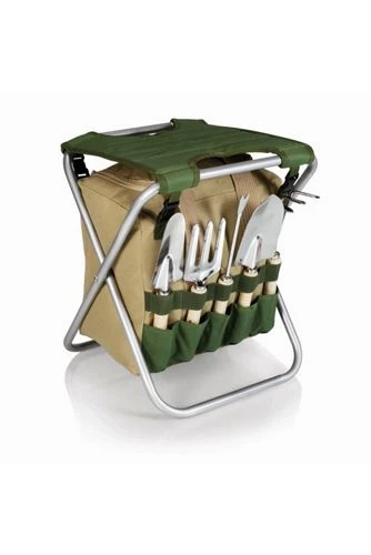 - 5 Steel gardening tools (Garden Fork, Weeder, Broad Face Trowel, Cultivator/Hand Rake, and Narrow Face Trowel) with wooden handles that feature leather ties