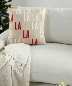 - Modern holiday throw pillow with the phrase “Fa La La” embroidered in white, beige, and red is a chic and festive topper to your seating area