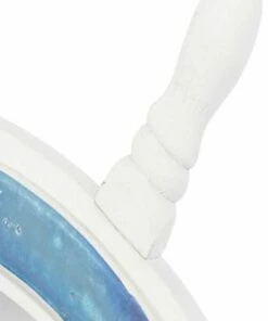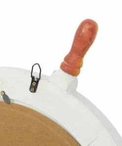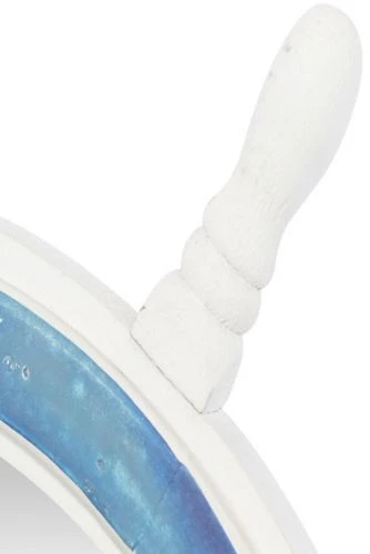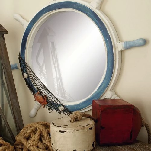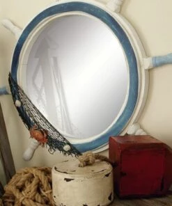 - This coastal ship wheel mirror comes in white, blue, and orange finishes