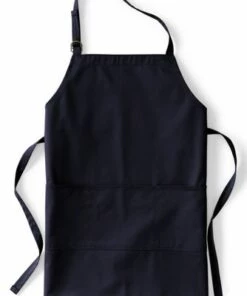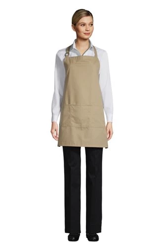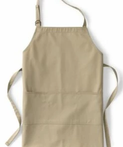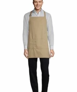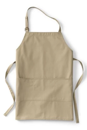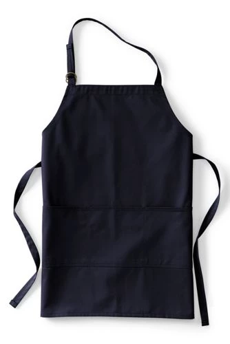 The fabric is treated with a stain-repellent finish, so spills simply blot off. Apron has handy front pockets, adjustable neck strap, waist ties, and plenty of room for the cook’s monogram.