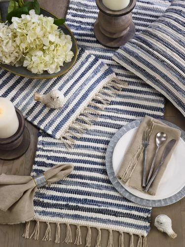 Take modern style to a new level with these stylish Striped Denim Chindi placemats. A lovely combination of bucolic design and modern print, these table mats are the perfect backdrop for your dishes and tableware. You can coordinate with a solid color or even a matching runner.