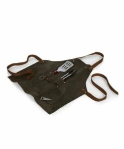 - Sturdy khaki waxed cotton canvas apron with neck and waist straps